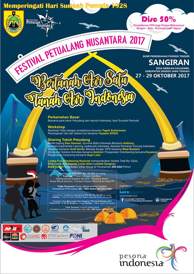 Festival Petualang Nusantara kembali digelar tahun ini. Bertempat di Bumi Perkemahan Puden Tingkir, Sangiran, Festival Petualang Nusantara (FPN) 2017 akan dilaksanakan padaa tanggal 27-29 Oktober 2017. Penyelenggaraan ini mendapat dukungan dari Kementerian Pariwisata, Bupati Sragen, BPSMP Sangiran, dan Desa Krikilan serta Pengelola Bumi Perkemahan Punden Tingkir. kegiatan ini dapat dijadikan ajang promosi wisata petualangan yang dipaddukan dengan wisata sejarah dan budaya. Peserta FPN diajak berpetualang dengan menyusuri jejak-jejak pra sejarah di Situs Sangiran yang telah menghebohkan dunia.