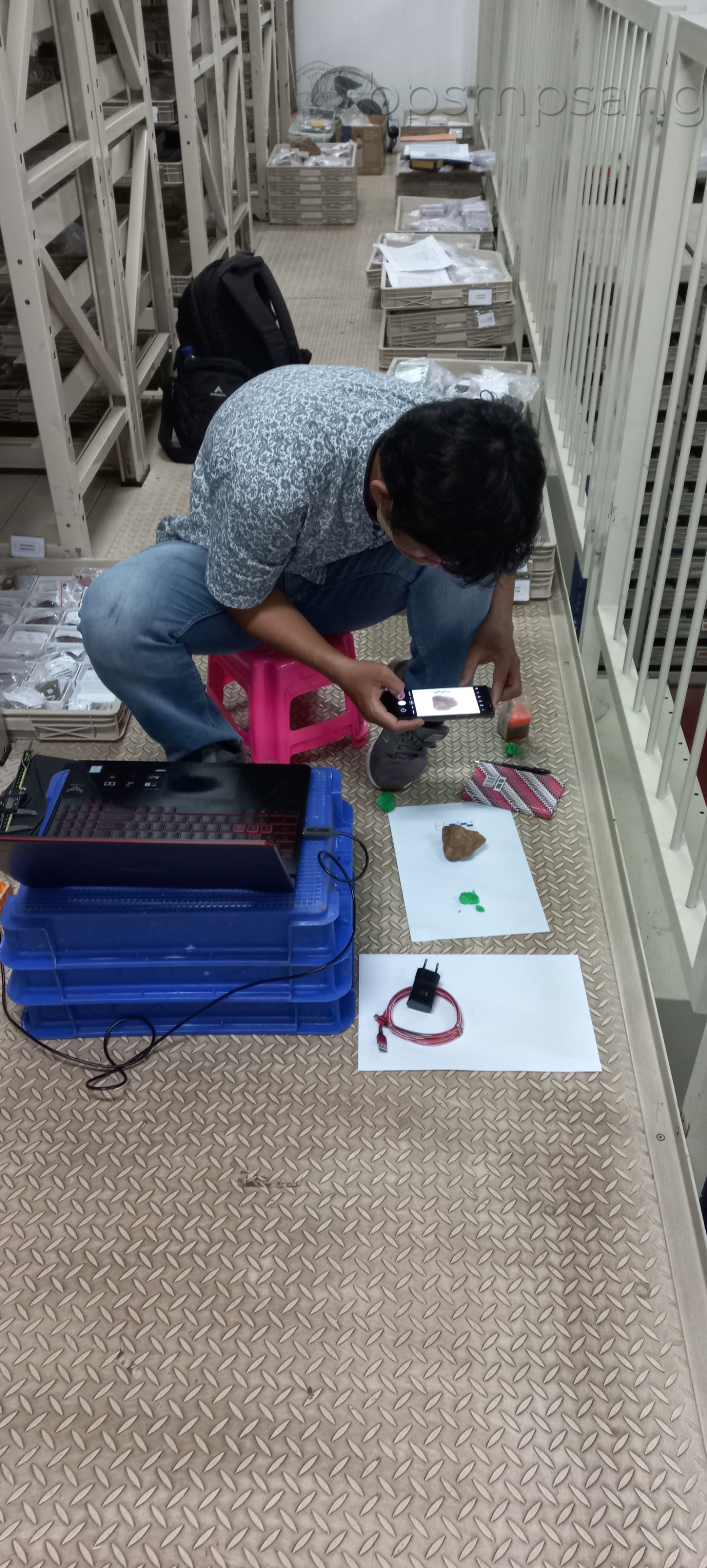 Foto kegiatan: koordinasi dengan pimpinan dan staf Museum Geologi Bandung (atas), pemotretan fosil binatang dan alat batu (bawah)
