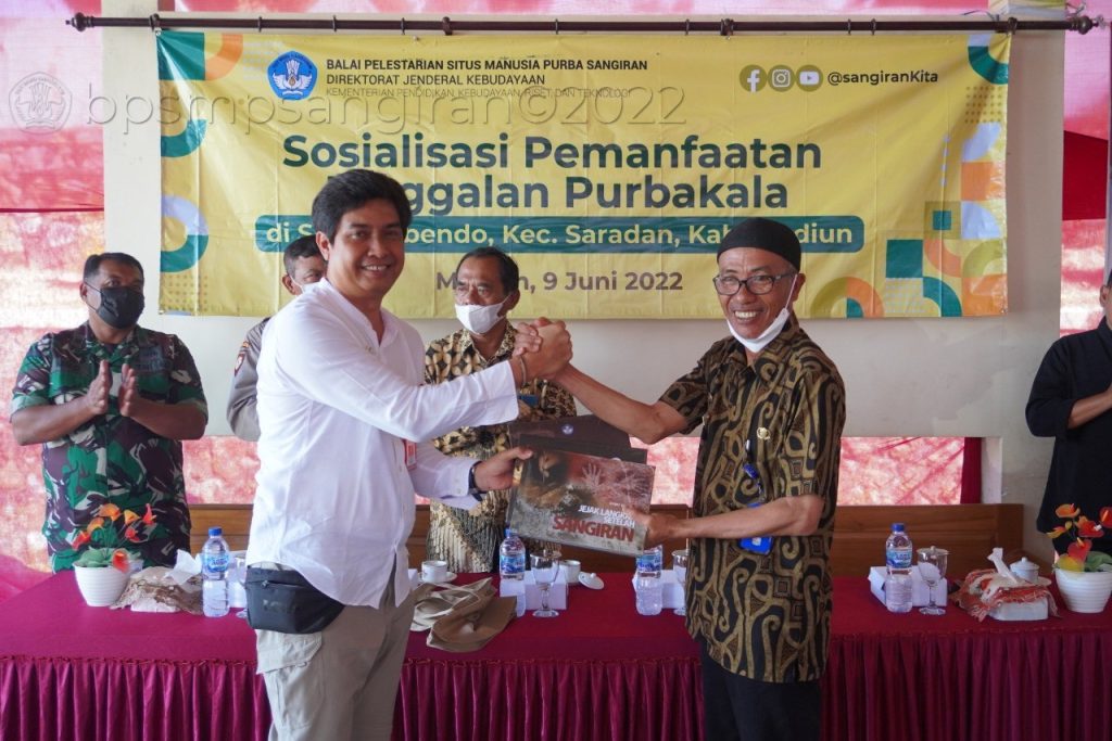 Balai Pelestarian Situs Manusia Purba Sangiran bekolaborasi dengan Dinas Pendidikan dan Kebudayaan Kabupaten Madiun menggelar sosialisasi tinggalan purbakala di Balai Desa Sumberbendo, Kec. Saradan, Kab. Madiun, Kamis pagi (9/6/2022).